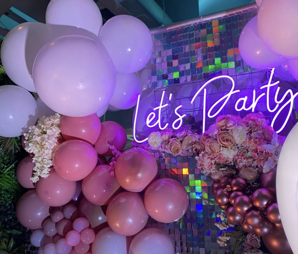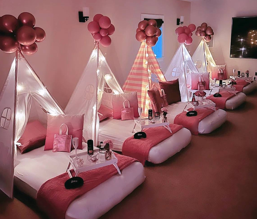 Pajamas Party Sleepover fully equipped (includes teepee, mattress, protection, carpet, mini-table, pillow, lights, decorative flowers, message light box, balloons, thematic decorations)