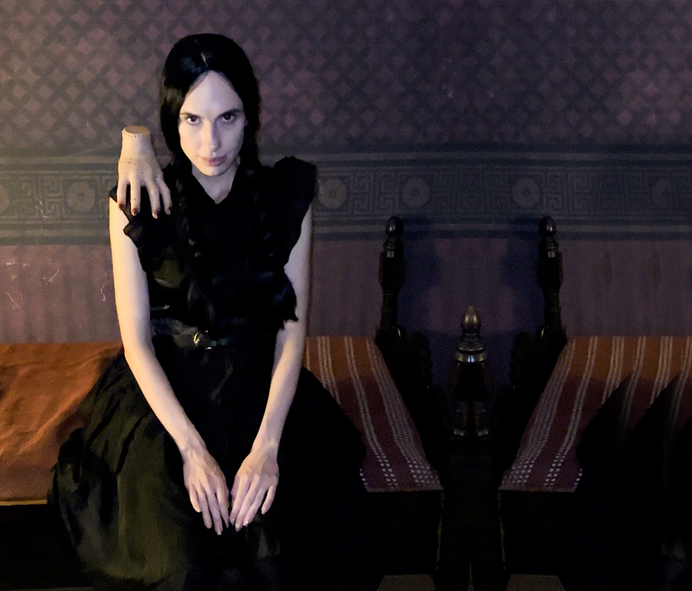 macabre, often identified by her pale skin and black pigtails.